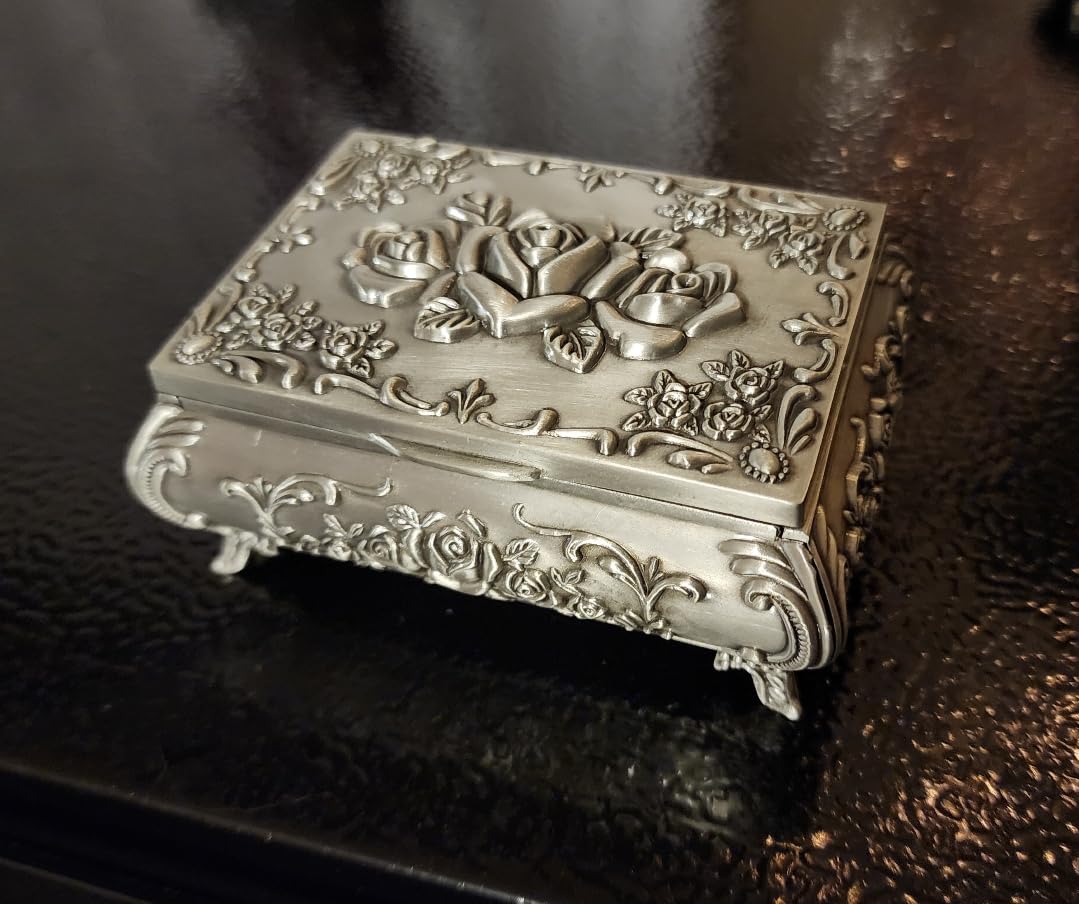 This jewelry box is the perfect size for a few things. I wanted something to sit on the back of my toilet to put my wedding rings in before I shower, then they are right there after I shower and am getting ready to go somewhere. I also keep my tweezers in it. I don’t have any drawers in my small bathroom, so this is very convenient. The design is beautiful. I didn’t expect it to be as beautiful as it is. It’s also heavy and won’t slide around easily. I really like it. You won’t be disappointed.